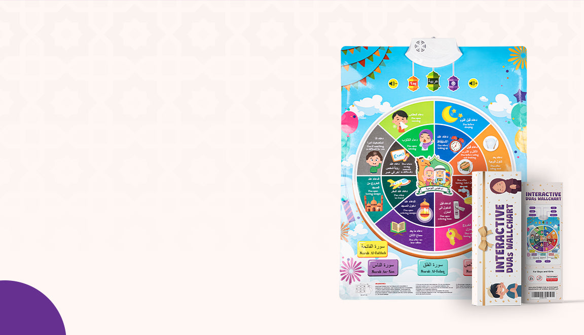Learning Salat Made Easy - Our smart prayer mat for kids features a fun and engaging design. The markers and LED Salat position indicator help children remember the proper posture for praying. Designed for Interactive Fun - This Muslim prayer rug for kids is packed with features: a Mosque-shaped speaker, LCD Rakat counter, compass, 50 touch-sensitive buttons, and professional Quran reciter. A Comfortable Praying Mat...Regular price $42.99Regular priceUnit price / perSale price $42.99Almostaqim Dua Wall Chart - Interactive Islamic Learning Tool for Kids - Visual & Audio Teaching of Duas & Quran Surahs in Arabic, English - Islamic Gifts for Muslims, Children & Families for Ramadan