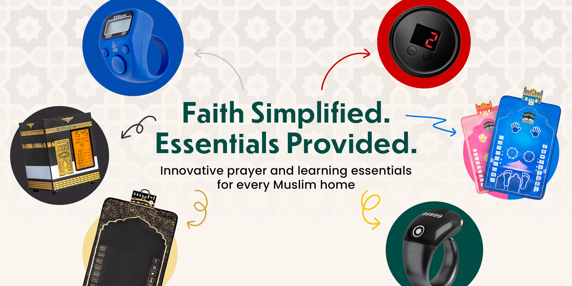 Learning Salat Made Easy - Our smart prayer mat for kids features a fun and engaging design. The markers and LED Salat position indicator help children remember the proper posture for praying. Designed for Interactive Fun - This Muslim prayer rug for kids is packed with features: a Mosque-shaped speaker, LCD Rakat counter, compass, 50 touch-sensitive buttons, and professional Quran reciter. A Comfortable Praying Mat...Regular price $40.99Regular priceUnit price / perSale price $40.99ALMOSTAQIM 6-Pack Digital Tally Finger Counter with Led, Colorful Tasbeeh Tasbih 5-Digits Counter Clickers with Led Light, Carry Ring, Individual Hard Case for Muslims Pray Knitting Track Golf Lap