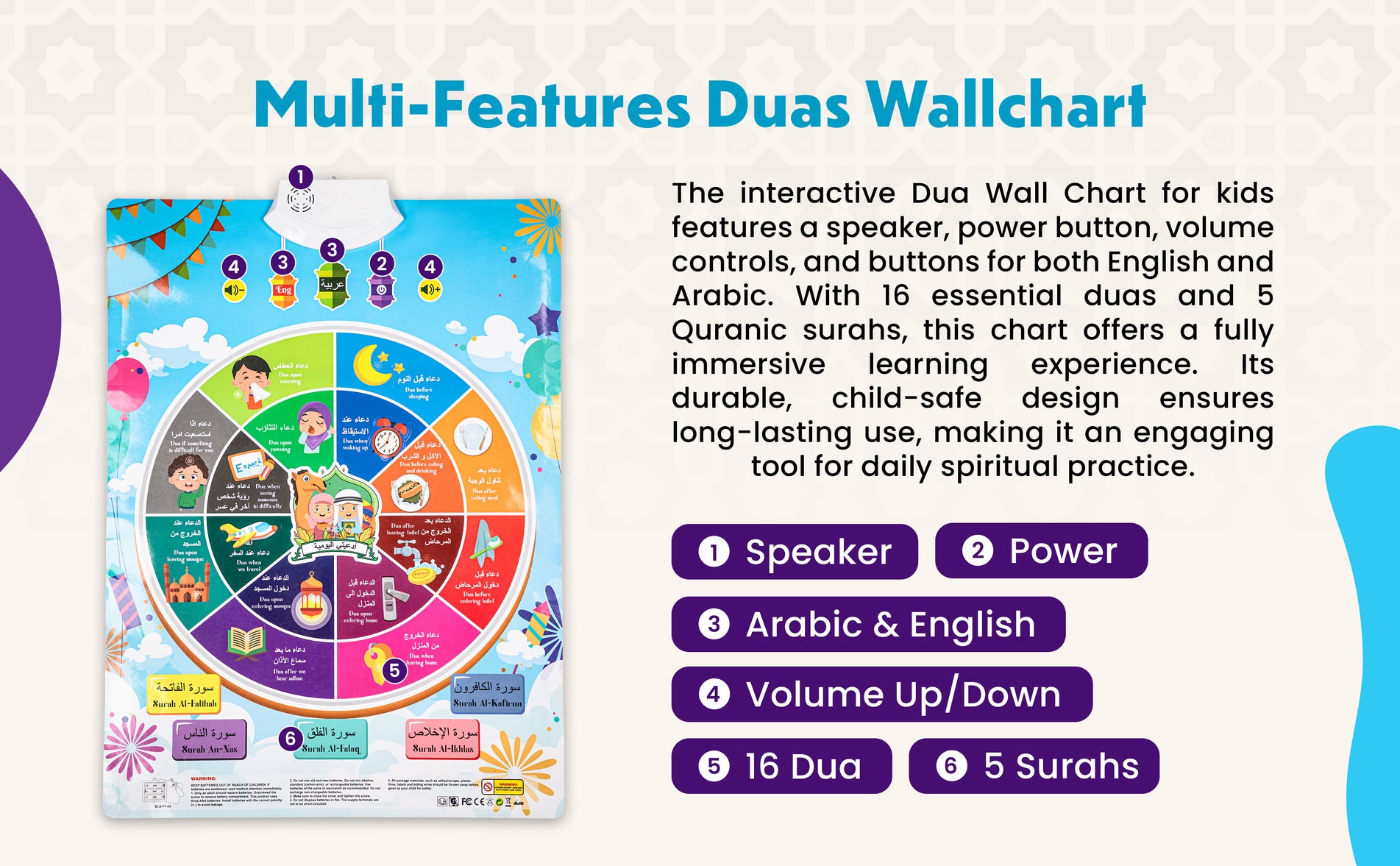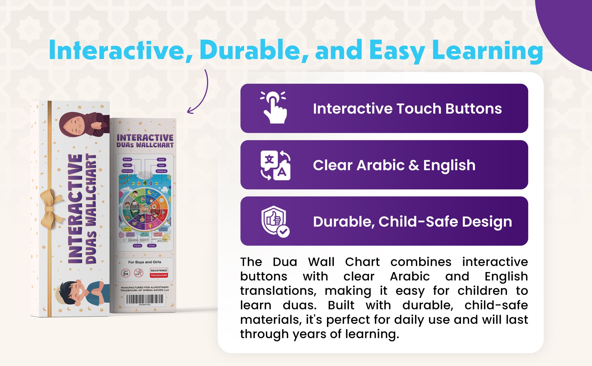 - Interactive Learning - Learning duas is exciting with this talking Islamic wall chart! Just touch a dua and hear it recited in clear Arabic with English translation, helping kids memorize and understand.